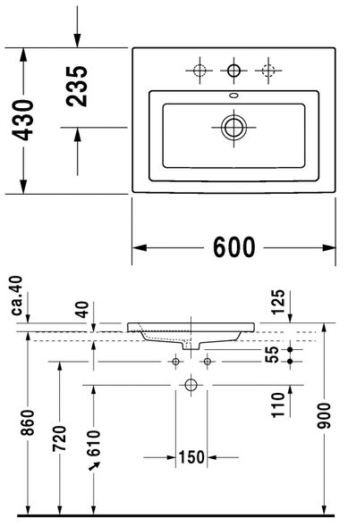 Umywalka z półką, z otworem na baterię, z otworem przelewowy, do montażu od góry, tył glazurowany.