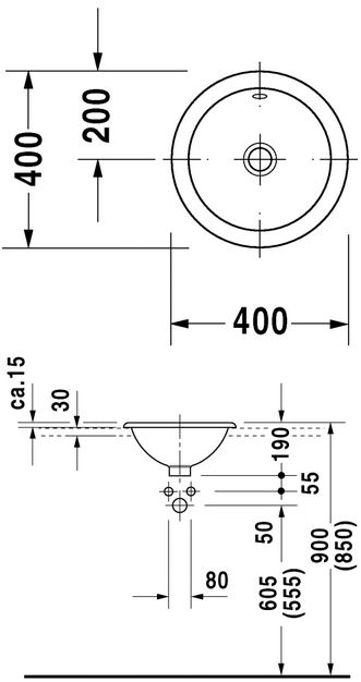 Umywalka stawiana na blat, do montażu od góry, bez półki, bez otworu na baterię, z otworem przelewowym, od spodu glazurowana.