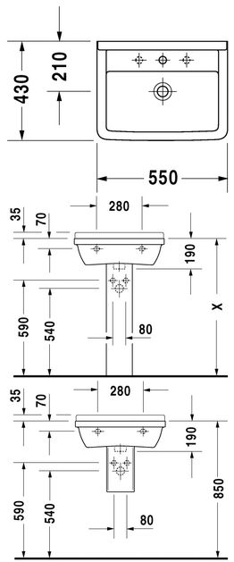 Umywalka z półką, z otworem na baterię, z otworem przelewowym.