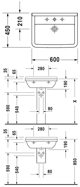 Umywalka z półką, z otworem na baterię, z otworem przelewowym.
