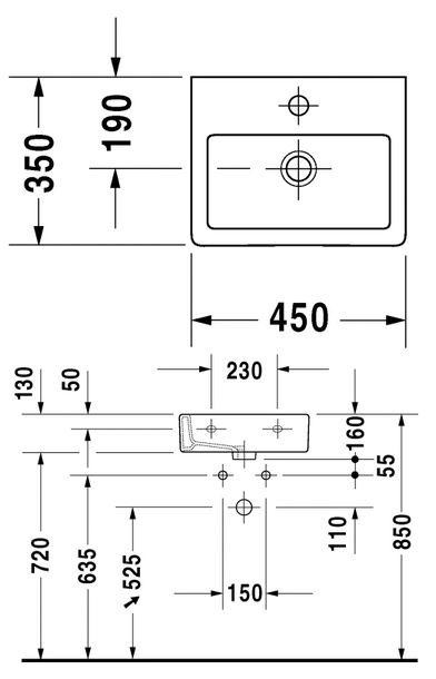 Umywalka szlifowana z półką, z otworem na baterię, z otworem przelewowym.