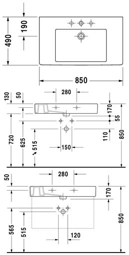 Umywalka z półką, z otworem na baterię, z otworem przelewowym.