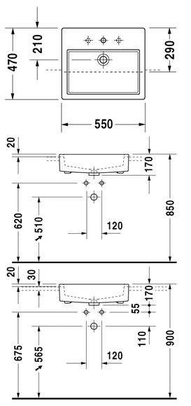 Umywalka półblatowa z półką, z otworem na baterię, z otworem przelewowym.