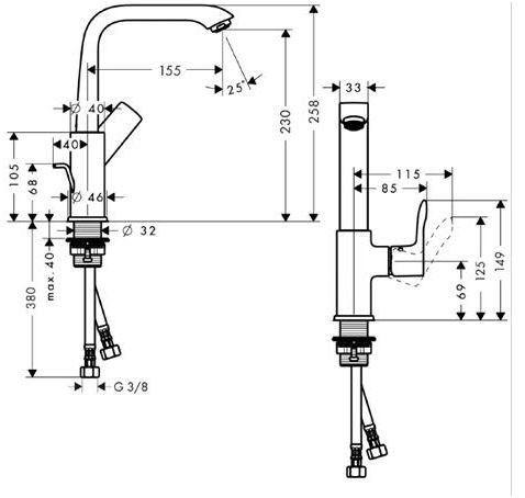 Jednouchwytowa bateria umywalkowa 230, DN15, bez otworu na cięgło