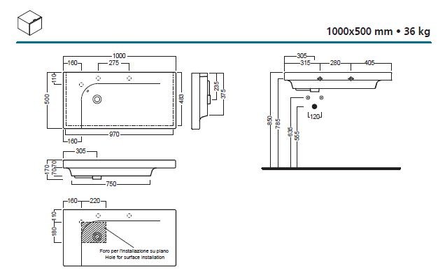 Umywalka z 1 otworem na baterię, posiada podcięcia do wybicia otworu ( miejsca widoczne na rysunku technicznym )