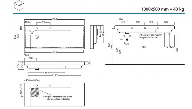 Umywalka z 1 otworem na baterię, posiada podcięcia do wybicia otworu ( miejsca widoczne na rysunku technicznym )