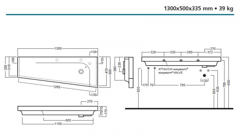 Umywalka z 1 otworem na baterię, posiada podcięcia do wybicia otworu ( miejsca widoczne na rysunku technicznym )
