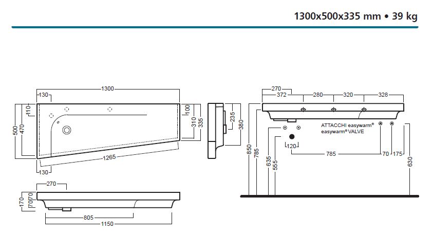 Umywalka bez wybitych otworów na baterię, posiada podcięcia do wybicia otworu ( miejsca widoczne na rysunku technicznym )