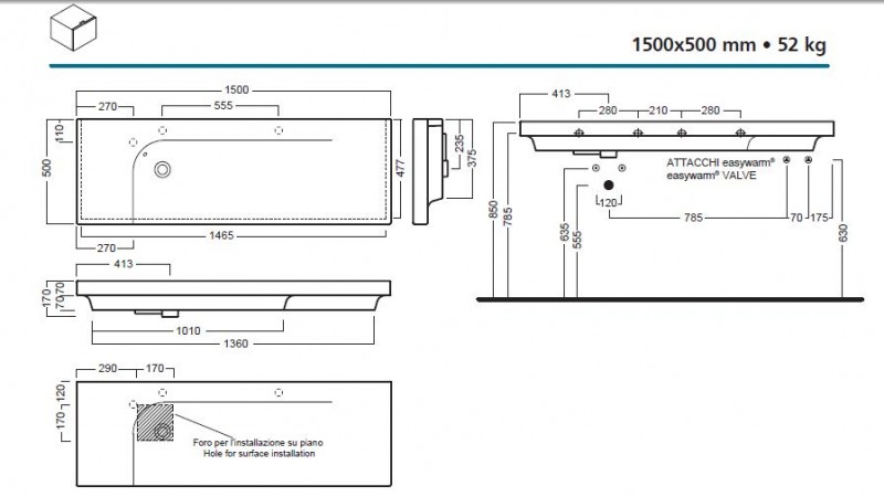 Umywalka z 1 otworem na baterię, posiada podcięcia do wybicia otworu ( miejsca widoczne na rysunku technicznym )