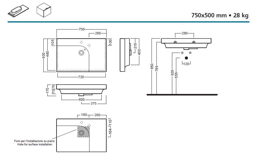 Umywalka bez wybitych otworów na baterię, posiada podcięcia do wybicia otworu ( miejsca widoczne na rysunku technicznym )