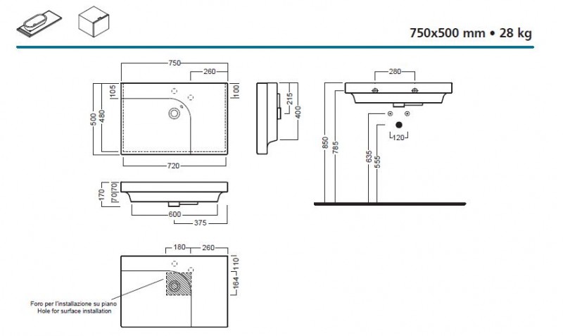 Umywalka z 1 otworem na baterię, posiada podcięcia do wybicia otworu ( miejsca widoczne na rysunku technicznym )