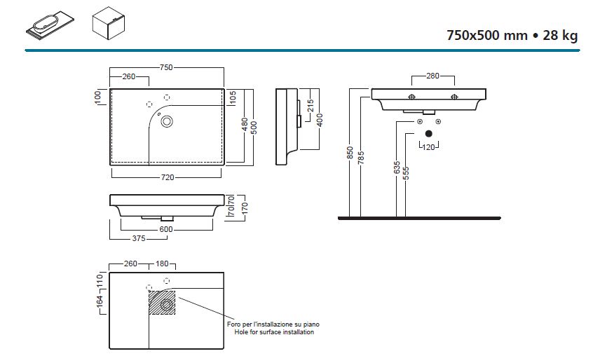 Umywalka bez wybitych otworów na baterię, posiada podcięcia do wybicia otworu ( miejsca widoczne na rysunku technicznym )