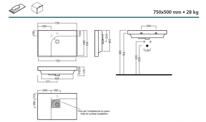 Umywalka z 1 otworem na baterię, posiada podcięcia do wybicia otworu ( miejsca widoczne na rysunku technicznym )