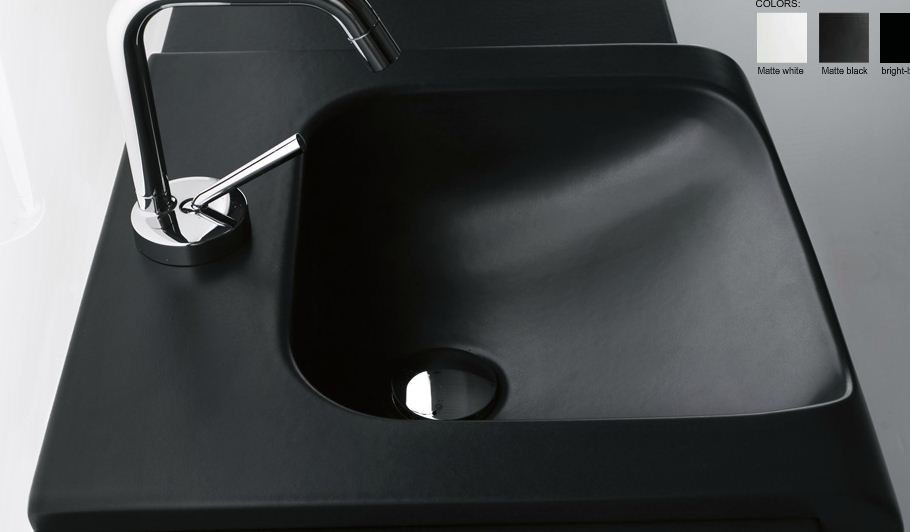 Umywalki można montować na dowolnym blacie, istnieje także możliwość kombinacji z ceramicznymi blatami i meblami dostępnymi w kolekcji.