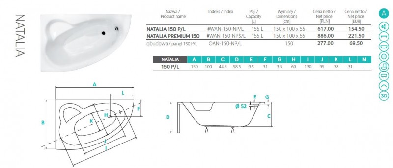 Wanna asymetryczna w wersji lewej, w komplecie z uchwytami oraz zagłówkiem.