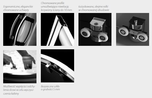 Seria Premium Plus to seria kabin o klasycznej formie, posiadających funkcjonalne i estetyczne rozwiązania techniczne. W skład serii wchodza 4 typy kabin: półokrągła, półokrągła typu B, kwadratowa oraz asymetryczna kabina półokrągła. Dwuczęściowe drzwi przesuwne osadzone są na łożyskowanych, skrętnych rolkach, które zapewniają ich cichą i bezawaryjną pracę. Skrzydło drzwi można wypiąć, w celu wyczyszczenia kabiny. Profile przyściennne wykonane ze stopu aluminium odpornego na korozję, umożliwiają niwelację krzywizny ściany. Szczelnośc kabiny zapewniają wysokiej jakości uszczelki elastomerowe oraz listwa magnetyczna. Kabiny dostępne są z wypełnieniem ze szkła bezpiecznego o grubości 5 mm pokrytego w powłoką Easy Clean w następujących rodzajach: przejrzystym, satinato, grafitowym, fabric, brązowym