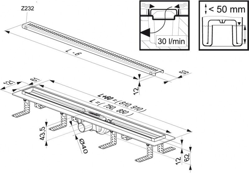 Odpływy Zebra dostępne są w rozmiarach 750 mm i 850 mm.