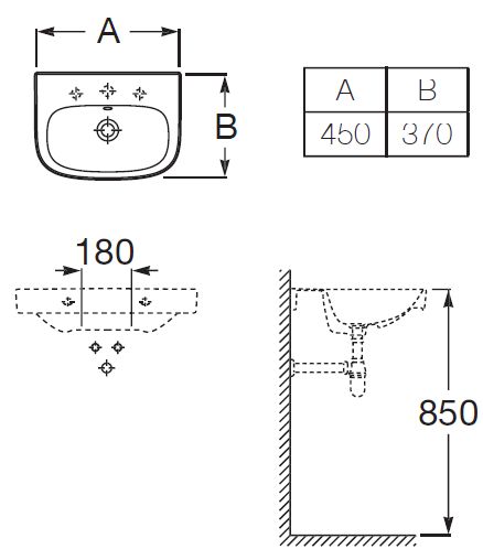Umywalka z otworem na baterie na środku, z otworem przelewowym.