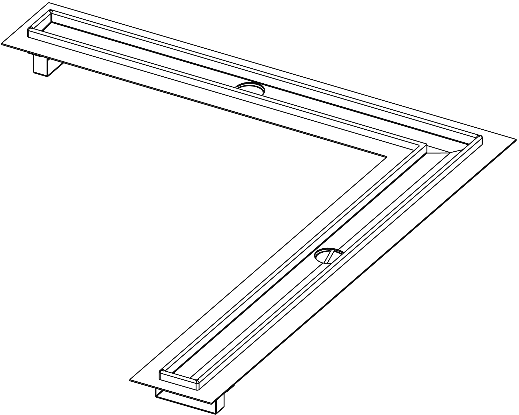 Rynna odpływowa TECEdrainline w wykonaniu narożnikowym 90' do montażu w jastrychu, z kołnierzem izolacyjnym i mankietem uszczelniającym do uszczelniania przez użytkownika.
