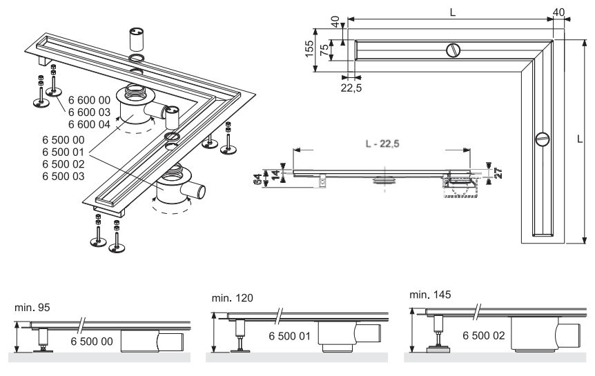 Rynna odpływowa TECEdrainline w wykonaniu narożnikowym 90' do montażu w jastrychu, z kołnierzem izolacyjnym i mankietem uszczelniającym do uszczelniania przez użytkownika.