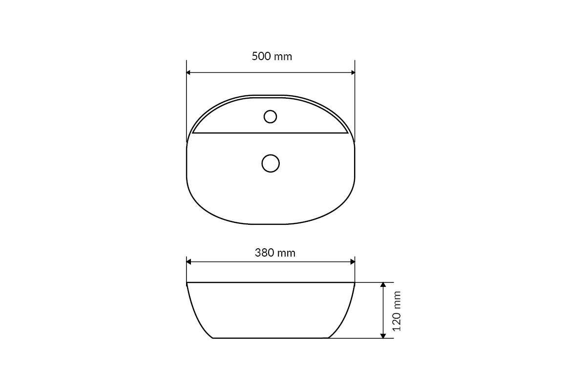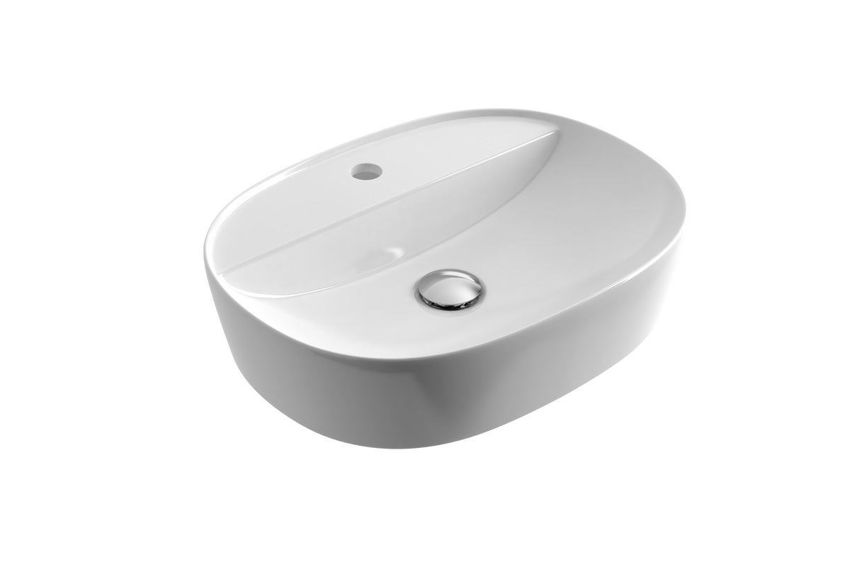 Umywalka bez przelewu i z otworem na baterie, do postawienia na blat lub powieszenia.