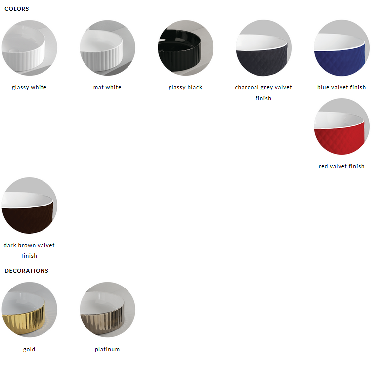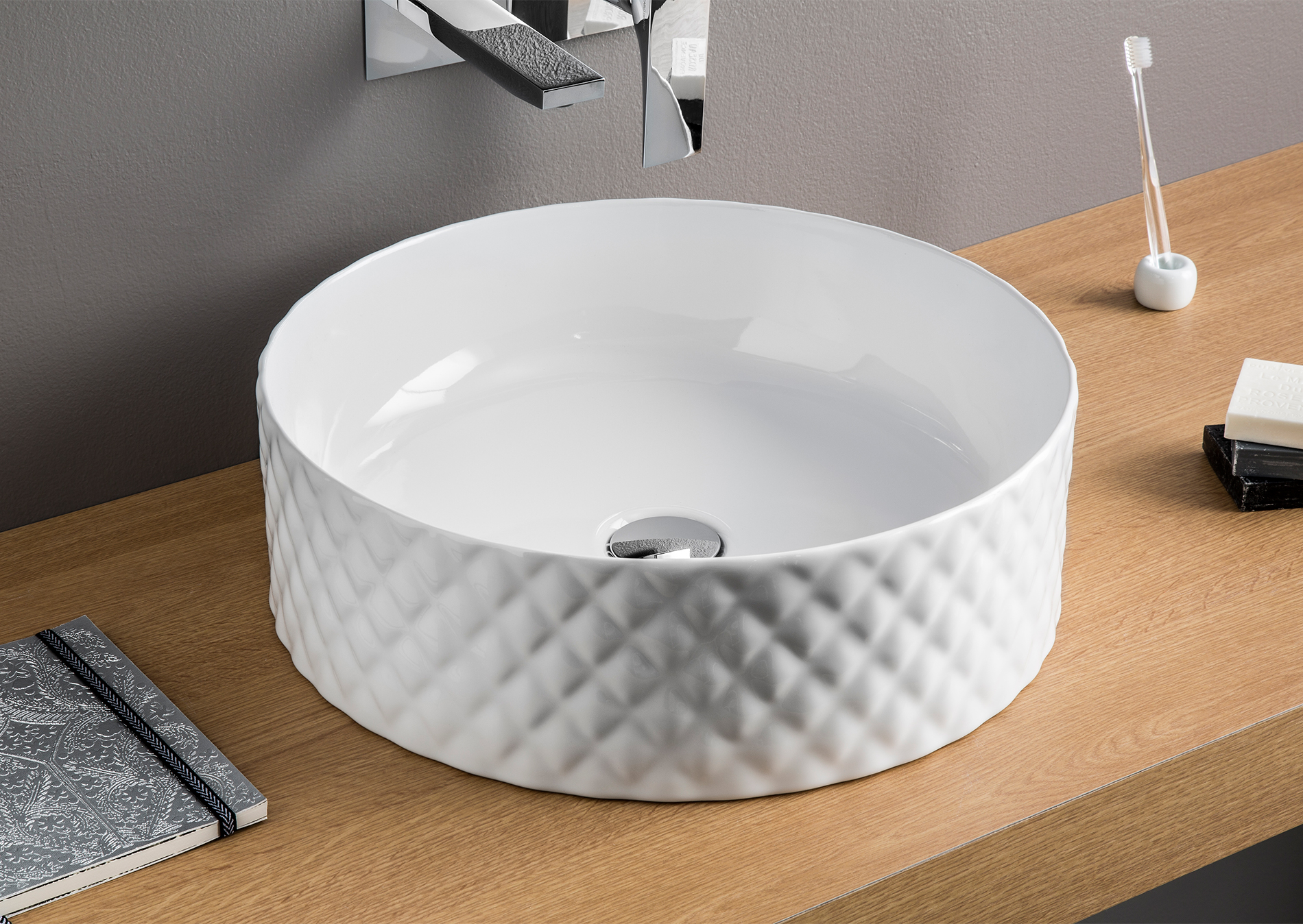 Cienki rant, dekor na zewnątrz umywalki, stawiana na blat ceramika kolor biały połysk,