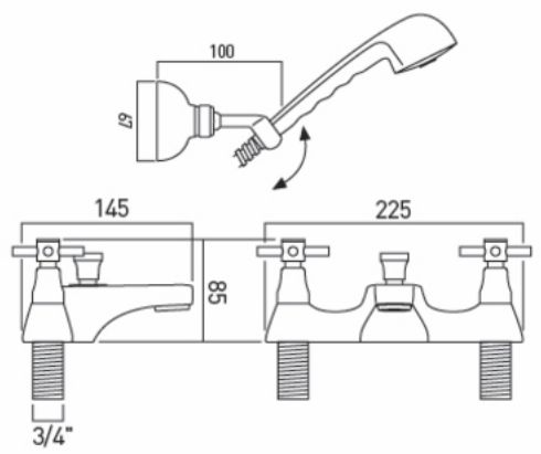 Vado Vecta bateria wannowa dwuuchwytowa dwuotworowa z zestawem prysznicowym chrom.