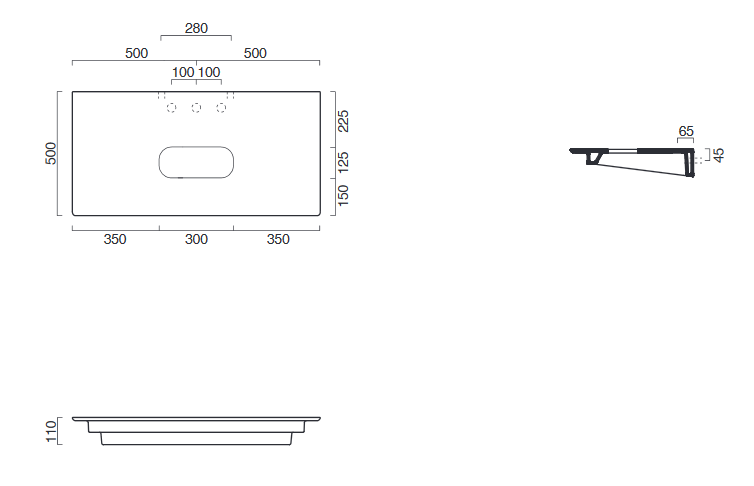 Blat ceramiczny bez otworu pod baterię odpowiedni do montażu umywalki na środku.