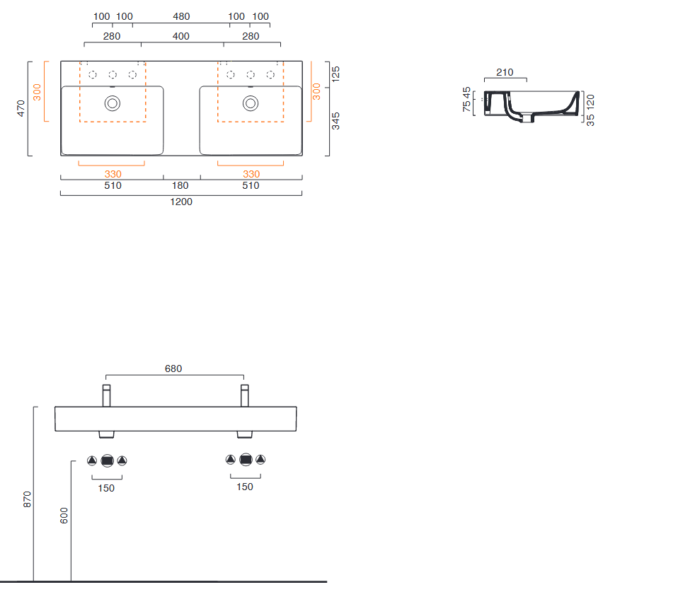 Wszystkie umywalki można zamontować na trzy różne sposoby: podwieszane, na blacie i na meblu oraz można je zintegrować z określonymi wieszakami na ręczniki.