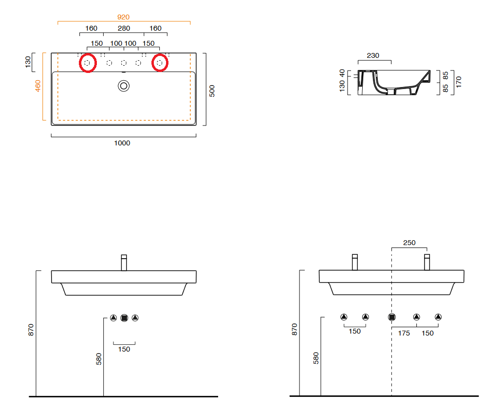 Umywalka posiada 2 skrajne otowry pod baterie.