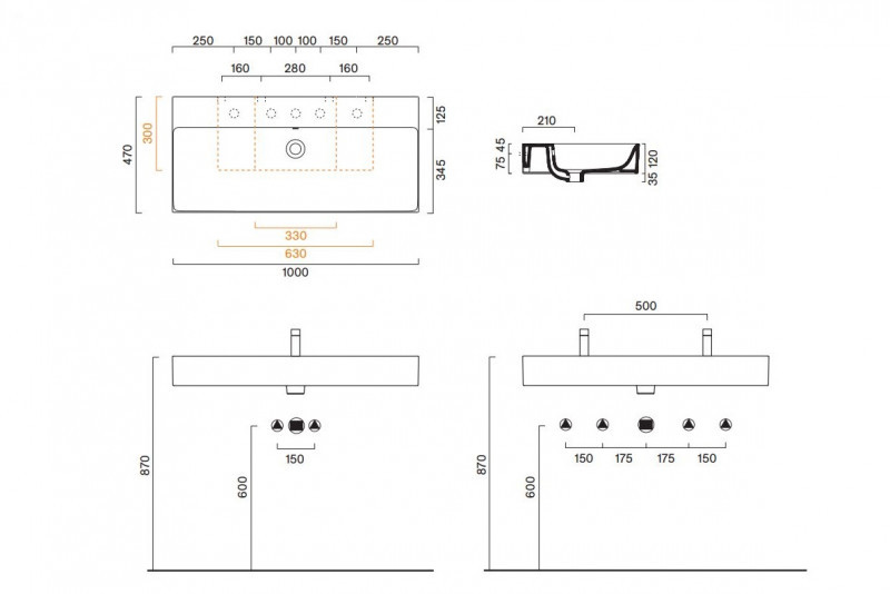 Wszystkie umywalki można zamontować na trzy różne sposoby: podwieszane, na blacie i na meblu oraz można je zintegrować z określonymi wieszakami na ręczniki.