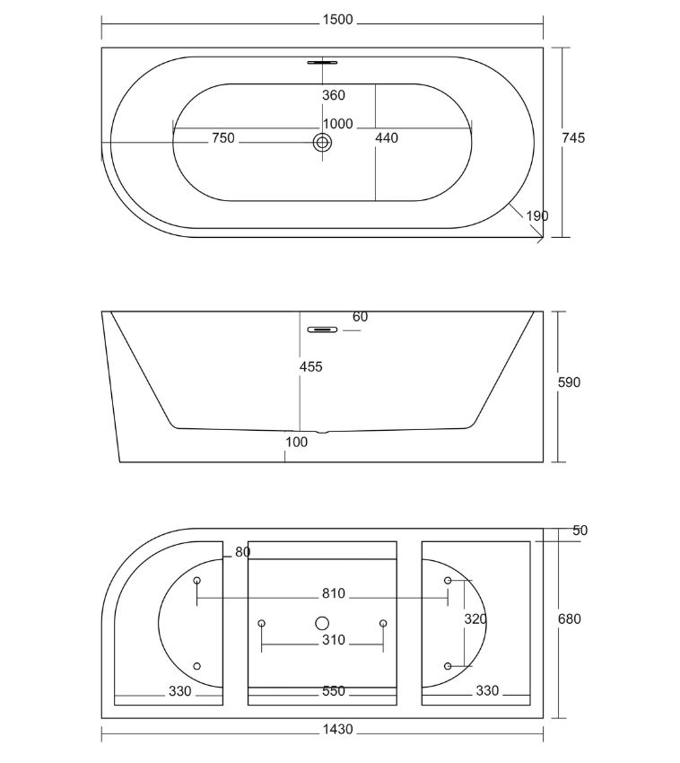 Szeroka, wzmacniana półka wanny została zaprojektowana z myślą o lepszej organizacji miejsca w łazience i możliwości zamontowania wannowej baterii otworowej. Ze względu na indywidualne preferencje i specyfikacje baterii otworowych, ich montaż należy wykonać we własnym zakresie lub zlecić hydraulikowi. Wiercenie otworów w półce nie wpływa na okres udzielanej gwarancji. Tylna ściana wanny przyściennej posiada konstrukcję otwartą, która umożliwia łatwy dostęp do przyłączy i komfortowy montaż.