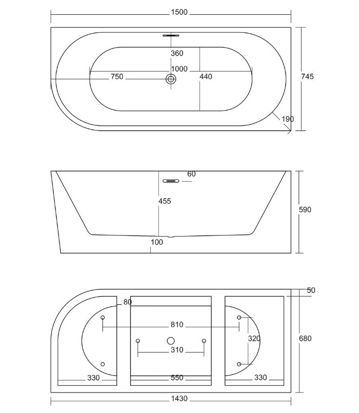 Szeroka, wzmacniana półka wanny została zaprojektowana z myślą o lepszej organizacji miejsca w łazience i możliwości zamontowania wannowej baterii otworowej. Ze względu na indywidualne preferencje i specyfikacje baterii otworowych, ich montaż należy wykonać we własnym zakresie lub zlecić hydraulikowi. Wiercenie otworów w półce nie wpływa na okres udzielanej gwarancji. Tylna ściana wanny przyściennej posiada konstrukcję otwartą, która umożliwia łatwy dostęp do przyłączy i komfortowy montaż.