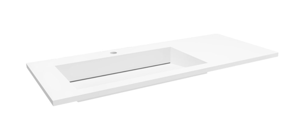 Długa, biała umywalka o asymetrycznym kształcie posiada nowoczesny odpływ liniowy centralny, misę boczną oraz funkcjonalny blat. Jej wyróżniającą cechą jest delikatny, cienki rant.