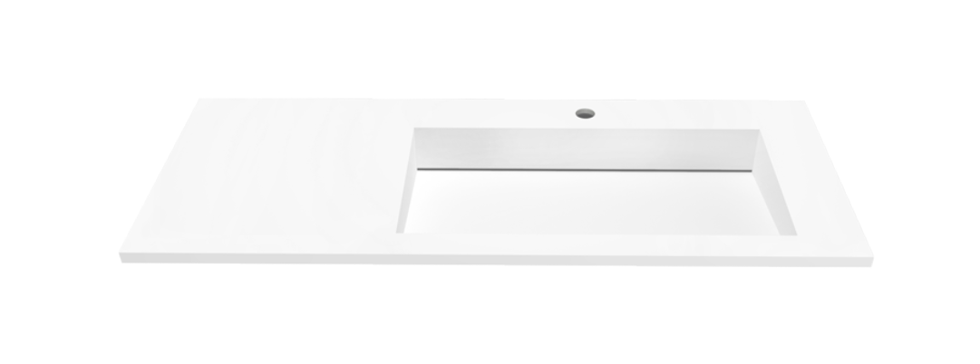 Długa, biała umywalka o asymetrycznym kształcie posiada nowoczesny odpływ liniowy centralny, misę boczną oraz funkcjonalny blat. Jej wyróżniającą cechą jest delikatny, cienki rant.