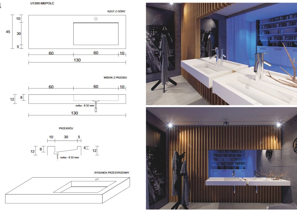 Opinie o: Cristalstone Linea Ideal umywalka z blatem prawa 130x45 cm z odpływem liniowym biały satynowy mat U1300-MBPOLC