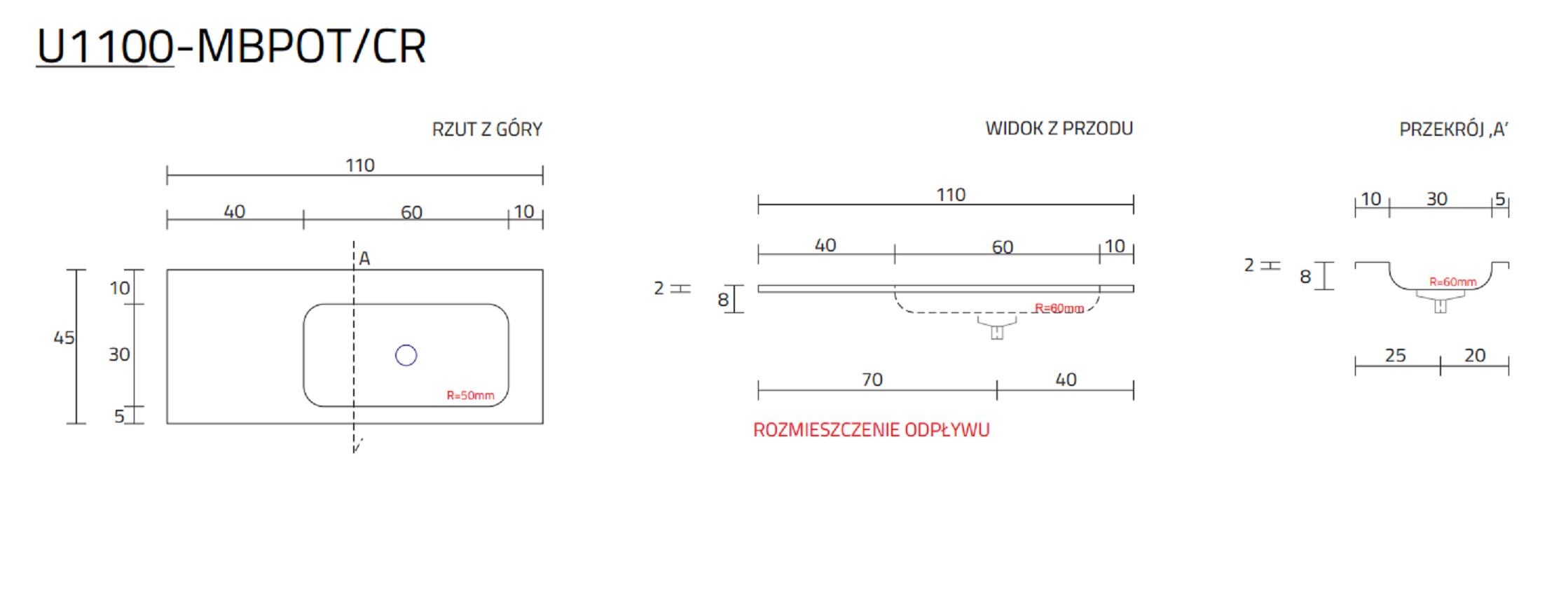 Cristalone Linea Simple Umywalka asymetryczna z cienkim blatem i odpływem tradycyjnym.