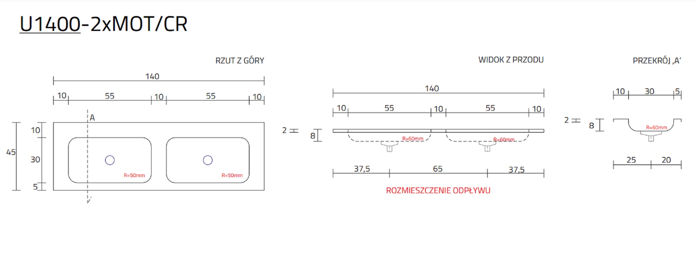 Cristalone Linea Simple Umywalka podwójna z cienkim blatem i odpływem tradycyjnym.