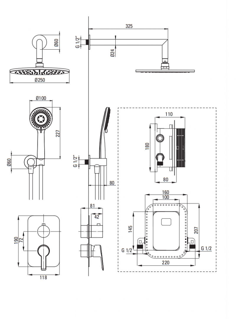 Zestaw prysznicowy składa się z BOXa mieszaczowego, deszczownicy i słuchawki wraz z uchwytem i wężem.