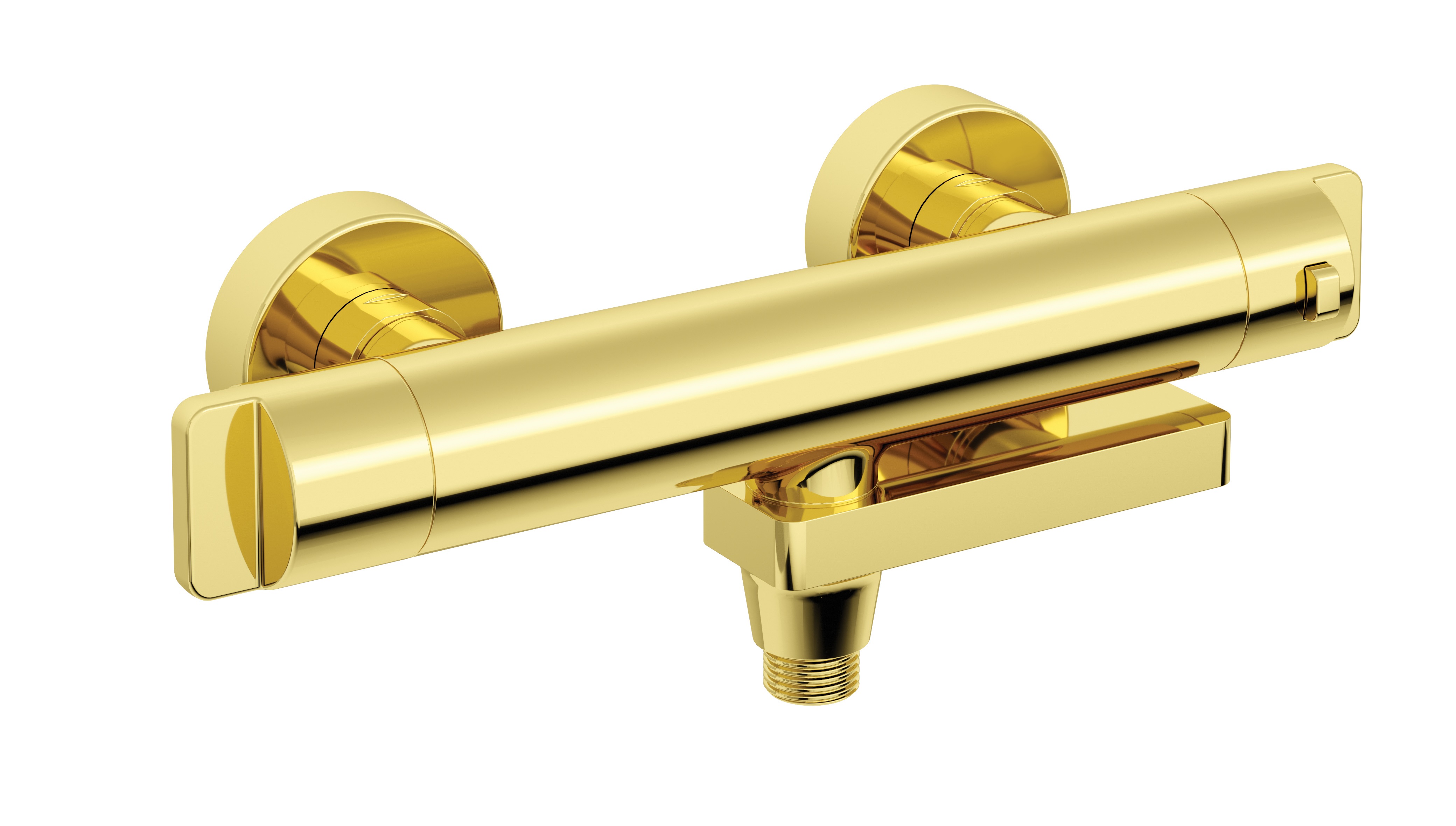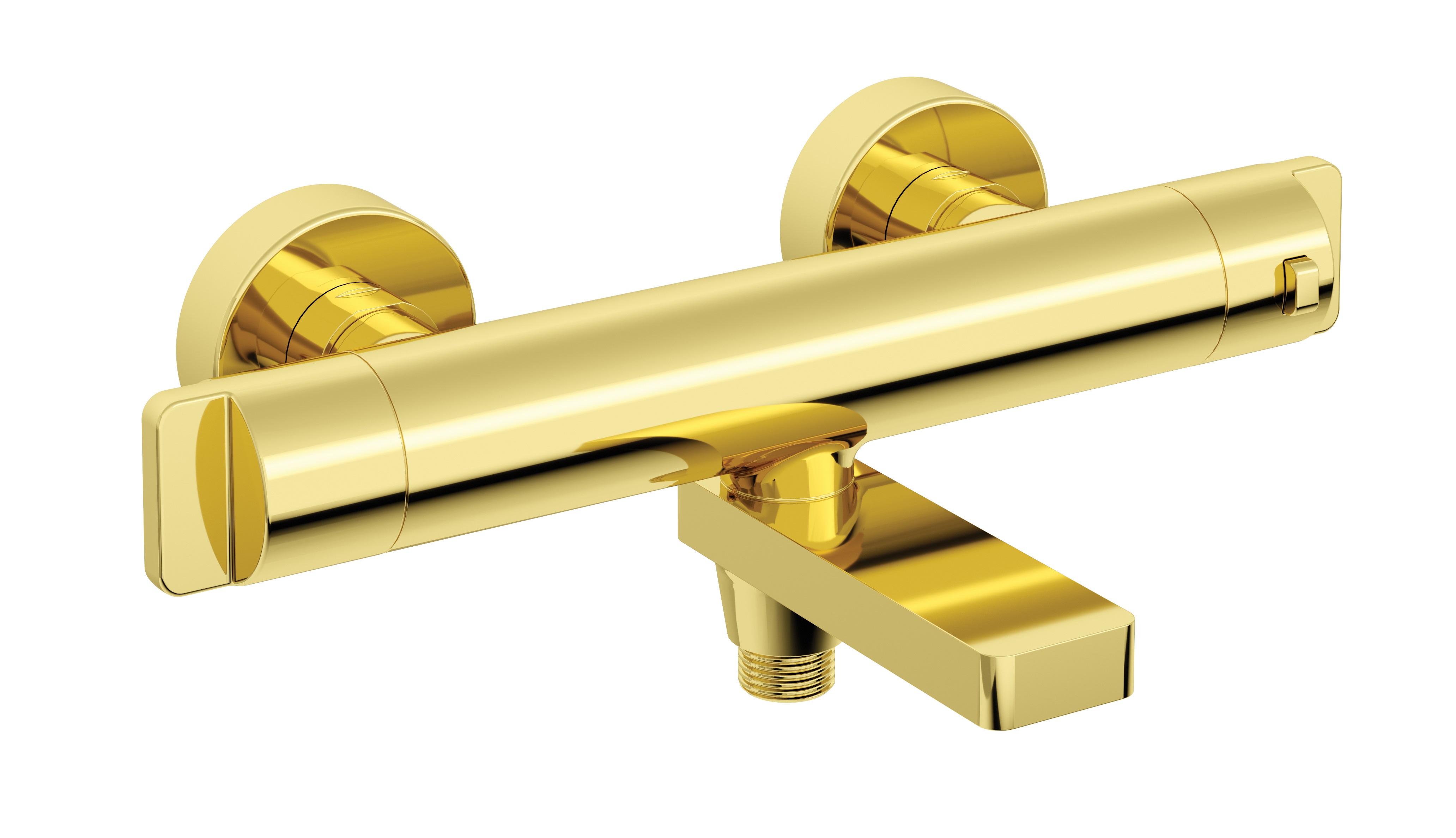 Bateria termostatyczna wannowa to model łączący wyjątkowy design z funkcjonalnością.. Składana wylewka znacznie poprawia komfort kąpieli i jednocześnie pełni funkcje przełącznika strumienia między baterią a słuchawką. Produkt wyposażony jest w blokadę komfortowej temperatury 38˚C, która zapobiega poparzeniom. Ponadto bateria termostatyczna posiada wyjątkowo ergonomiczne uchwyty, gwarantujące bezproblemową regulację strumienia wody. Złote wykończenie baterii doda łazience niepowtarzalnego charakteru.