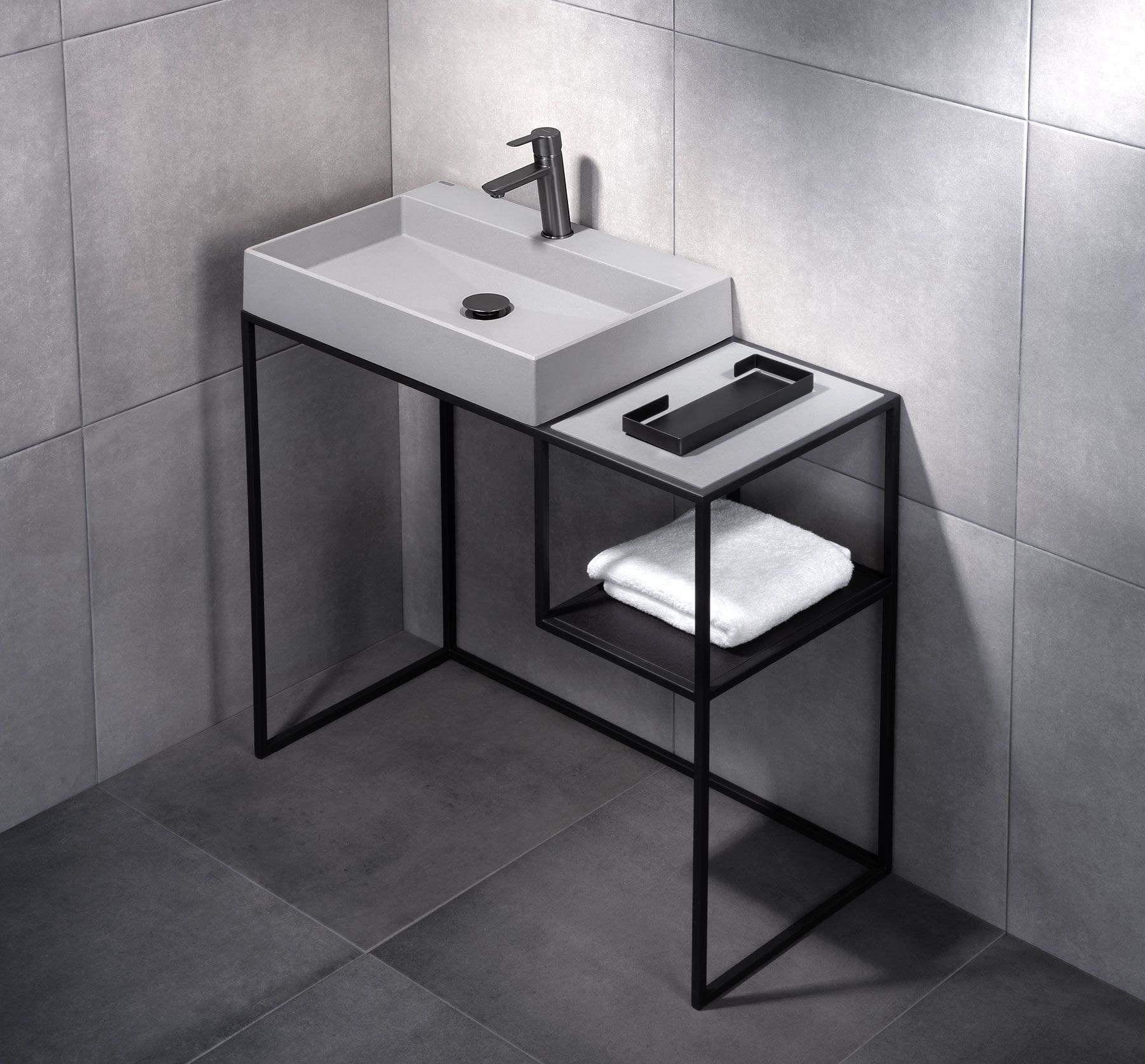 Dopełnieniem kolekcji Correo jest modułowa konsola łazienkowa, skrojona idealnie pod umywalki z tej samej serii. Stalowa konstrukcja, łącząca wytrzymałość z lekką formą stanowi doskonałą alternatywę dla klasycznej szafki pod umywalkę. Wersja podstawowa to konsola z umywalką solo, lub z kamiennymi półkami w trzech oryginalnych kolorach: gładkim białym, czarnym lub strukturalnym szarym. Jeżeli wielkość pomieszczenia na to pozwoli, konsolę można rozbudować o dodatkowe moduły: węższy 20 cm lub szerszy 30 cm. Poszczególne elementy można łączyć według własnego uznania i fantazji, co pozwala uzyskać rozmaite rezultaty stylistyczne. Specjalna konstrukcja węższego słupka umożliwia powieszenie go nawet na ścianie. Konsola nie posiada uciążliwych w pielęgnacji zakamarków, więc jest niezwykle łatwa w utrzymaniu czystości.