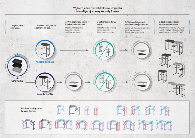 Dopełnieniem kolekcji Correo jest modułowa konsola łazienkowa, skrojona idealnie pod umywalki z tej samej serii. Stalowa konstrukcja, łącząca wytrzymałość z lekką formą stanowi doskonałą alternatywę dla klasycznej szafki pod umywalkę. Wersja podstawowa to konsola z umywalką solo, lub z kamiennymi półkami w trzech oryginalnych kolorach: gładkim białym, czarnym lub strukturalnym szarym. Jeżeli wielkość pomieszczenia na to pozwoli, konsolę można rozbudować o dodatkowe moduły: węższy 20 cm lub szerszy 30 cm. Poszczególne elementy można łączyć według własnego uznania i fantazji, co pozwala uzyskać rozmaite rezultaty stylistyczne. Specjalna konstrukcja węższego słupka umożliwia powieszenie go nawet na ścianie. Konsola nie posiada uciążliwych w pielęgnacji zakamarków, więc jest niezwykle łatwa w utrzymaniu czystości.