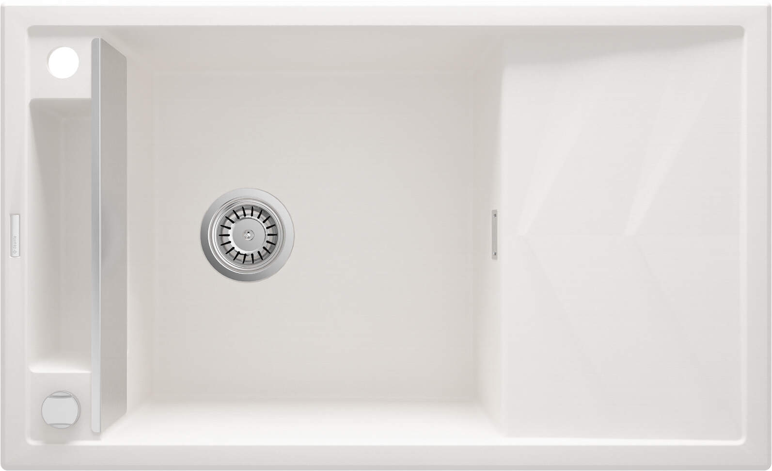 Granitowy zlewozmywak Magnetic posiada magnetyczne właściwości, które pozwalają na szybkie zorganizowanie jego przestrzeni pomocnymi akcesoriami - bez dodatkowych mocowań. Jest to model z jedną pojemną komorą oraz praktycznym ociekaczem z motywem jodełki, który przyspiesza odprowadzanie wody. Zlewozmywak wyposażony został w magnesy, dzięki którym na bok komory nałożyć można stalową maskownicę. Elegancka maskownica oddziela komorę od bocznej półki, która posłuży nam np. na osuszanie sztućców. Zamiast maskownicy do zlewozmywaka można zamontować koszyczki oraz reling i haczyk, które są do dokupienia w ofercie Deante.