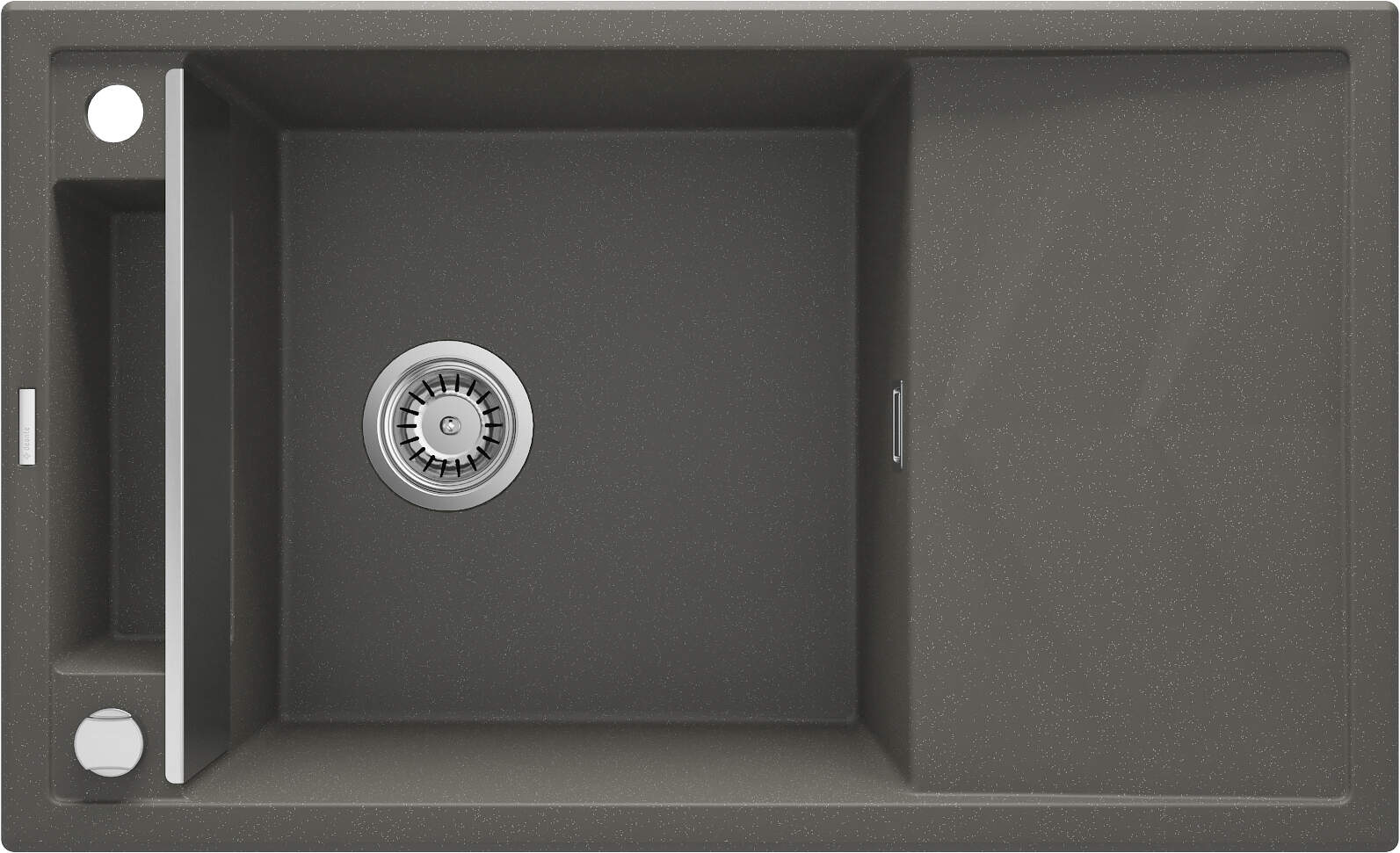 Granitowy zlewozmywak Magnetic posiada magnetyczne właściwości, które pozwalają na szybkie zorganizowanie jego przestrzeni pomocnymi akcesoriami - bez dodatkowych mocowań. Jest to model z jedną pojemną komorą oraz praktycznym ociekaczem z motywem jodełki, który przyspiesza odprowadzanie wody. Zlewozmywak wyposażony został w magnesy, dzięki którym na bok komory nałożyć można stalową maskownicę. Elegancka maskownica oddziela komorę od bocznej półki, która posłuży nam np. na osuszanie sztućców. Zamiast maskownicy do zlewozmywaka można zamontować koszyczki oraz reling i haczyk, które są do dokupienia w ofercie Deante.