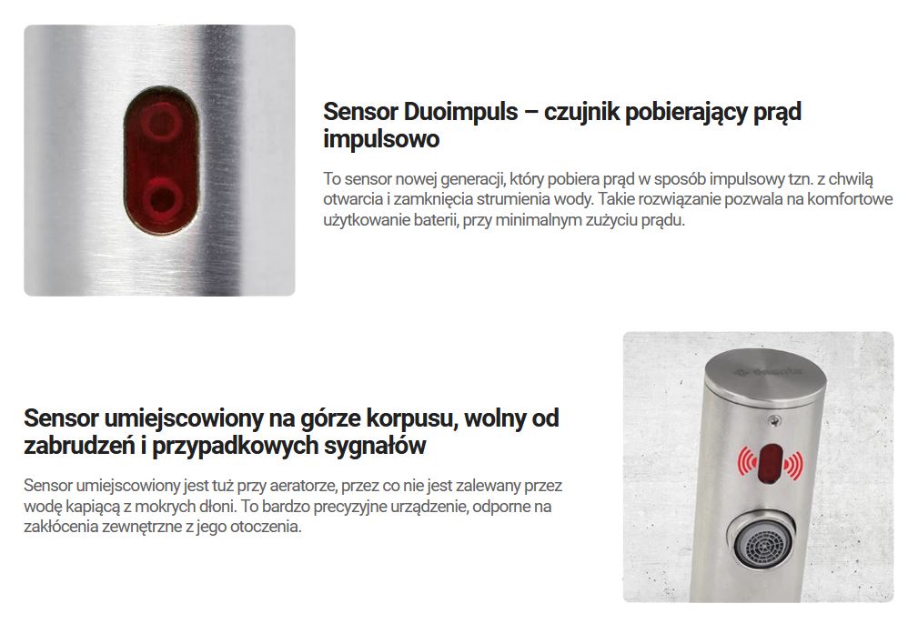 Bateria umywalkowa bezdotykowa pozwala zadbać zarówno o higienę, jak i środowisko. Aby uruchomić strumień wody, należy zbliżyć dłoń do sensora. Zamknięcie przepływu odbywa się z chwilą ich odsunięcia. Takie rozwiązanie gwarantuje niższe zużycie wody, komfort użytkowania i higienę. Bateria wykonana jest z wysokogatunkowej stali nierdzewnej. Ruchomy, silikonowy aerator jest głęboko osadzony i tym samym doskonale zabezpieczony przed wszelkimi uszkodzeniami.
