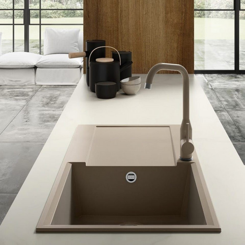 GRANITEK - materiał powstały z połączenia granitu oraz żywicy akrylowej, dodatkowo ulepszony przez redukcje wielkości cząsteczek granitowych co wpłynęło na znaczne wygładzenie powierzchni i ułatwia pielęgnację zlewozmywaka. Ma naturalny wygląd kamienia.