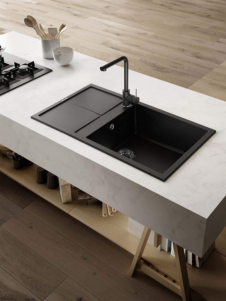 GRANITEK - materiał powstały z połączenia granitu oraz żywicy akrylowej, dodatkowo ulepszony przez redukcje wielkości cząsteczek granitowych co wpłynęło na znaczne wygładzenie powierzchni i ułatwia pielęgnację zlewozmywaka. Ma naturalny wygląd kamienia.
