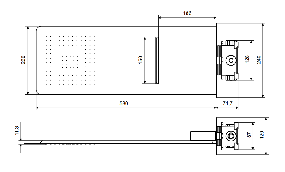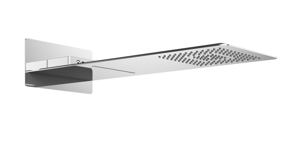 Cienka prostokątna głowica górna ścienna wykonana ze stali nierdzewnej w wykończeniu chrom o wymiarach 580×220mm.