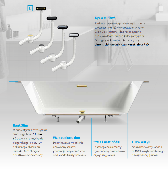 Wanna z minimalistycznym rozwiązaniem rantu o grubości 18mm pozwala na uzyskanie eleganckiego a przy tym delikatnego charakteru łazienki, rant Slim jest dodatkowo wzmocniony.