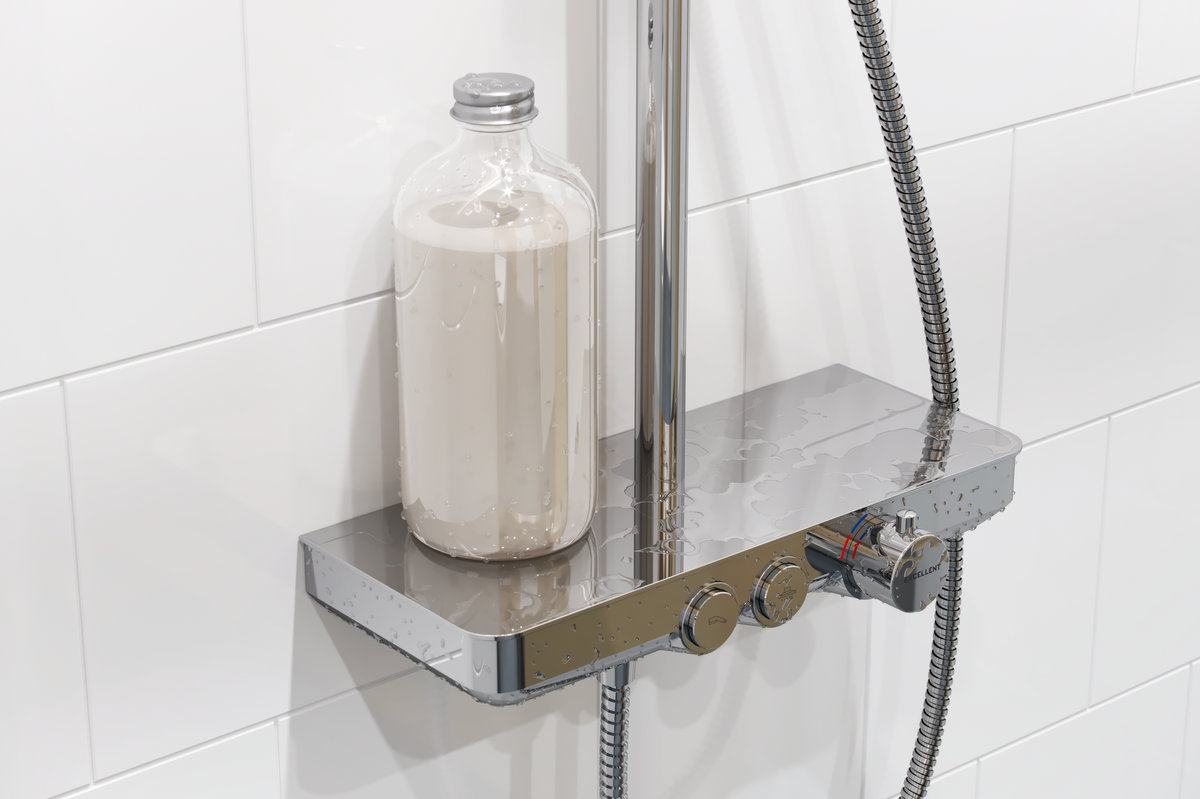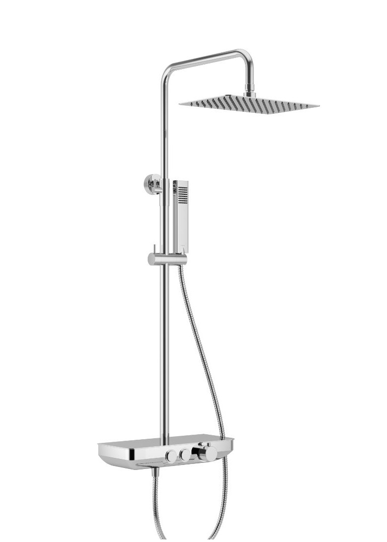 Zestaw wykonany z mosiądzu, posiada głowicę z systemem Easy-Click, który pozwala na regulację źródła wody. Ciśnienie jest stałe a regulacja temperatury znajduje się w lewym pokrętle. Istnieje możliwość regulacji wysięgu drążka i dopasowanie do wzrostu użytkownika.